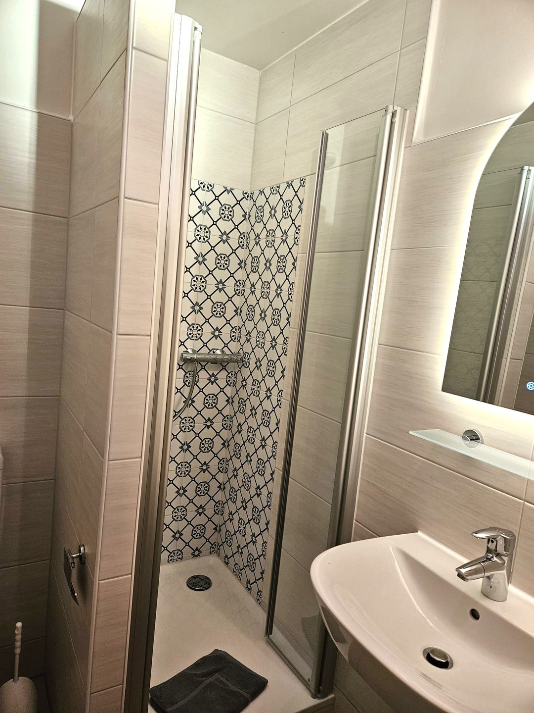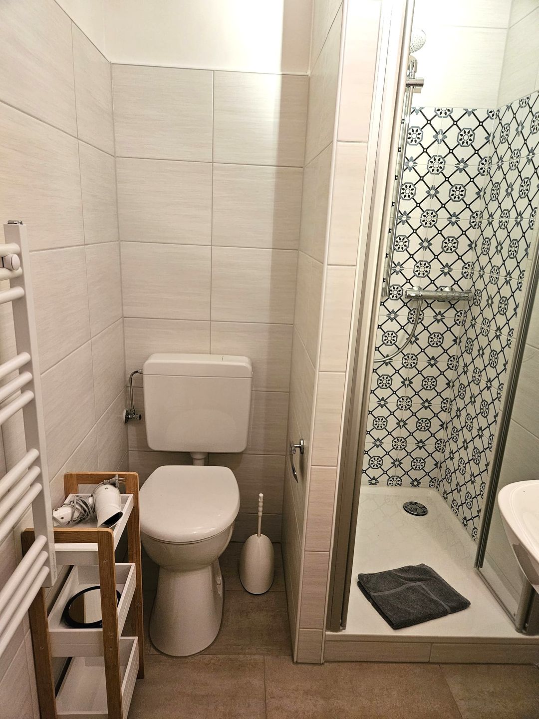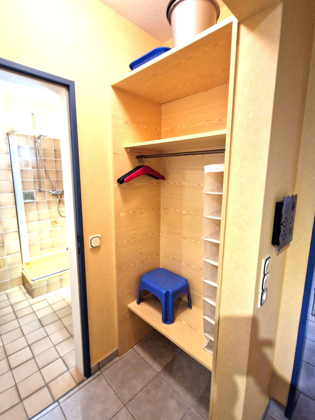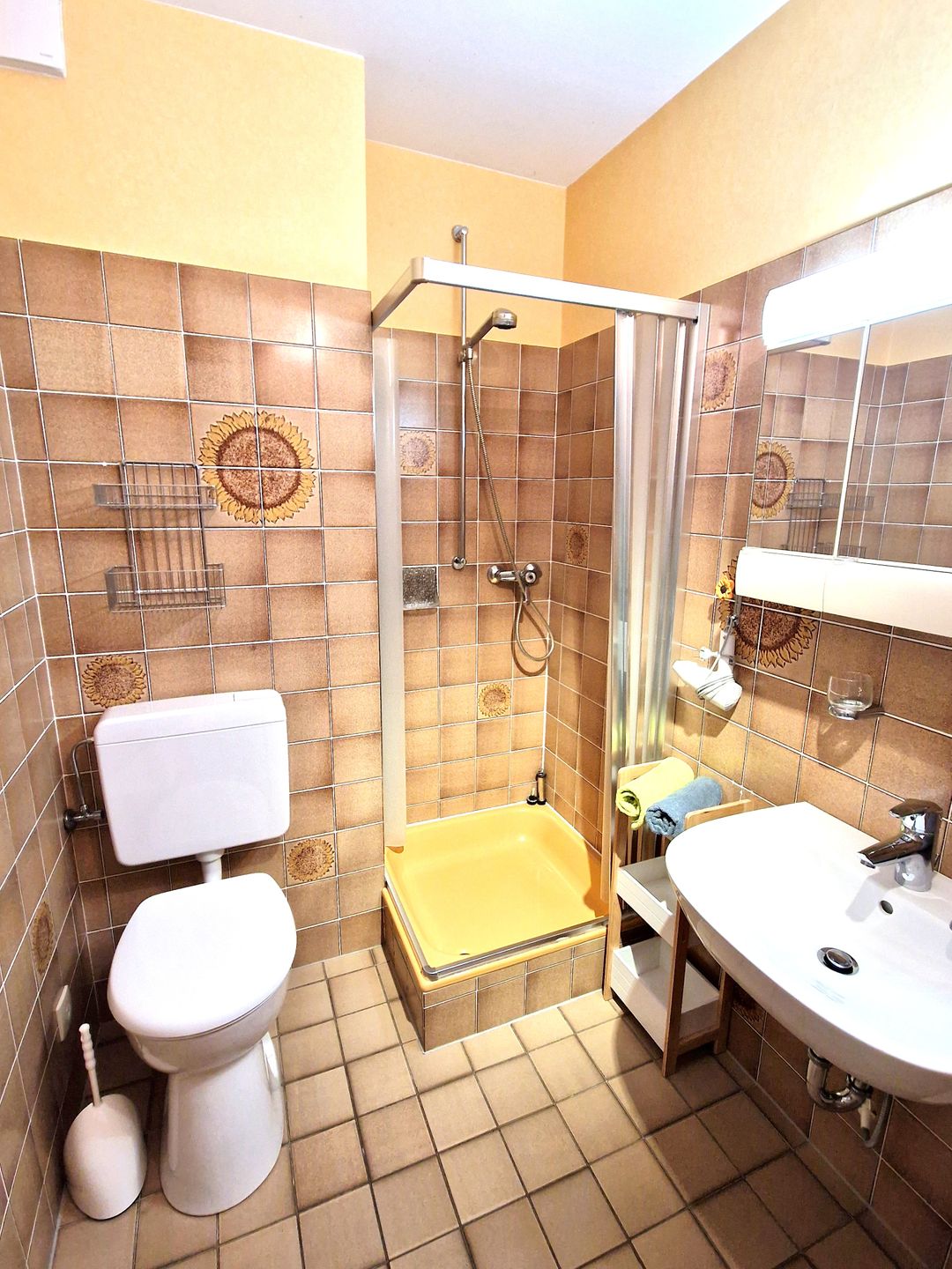 Weiter befinden sich in der Wohnung ein Schlafzimmer mit einem Doppelbett sowie ein kleines Duschbad.