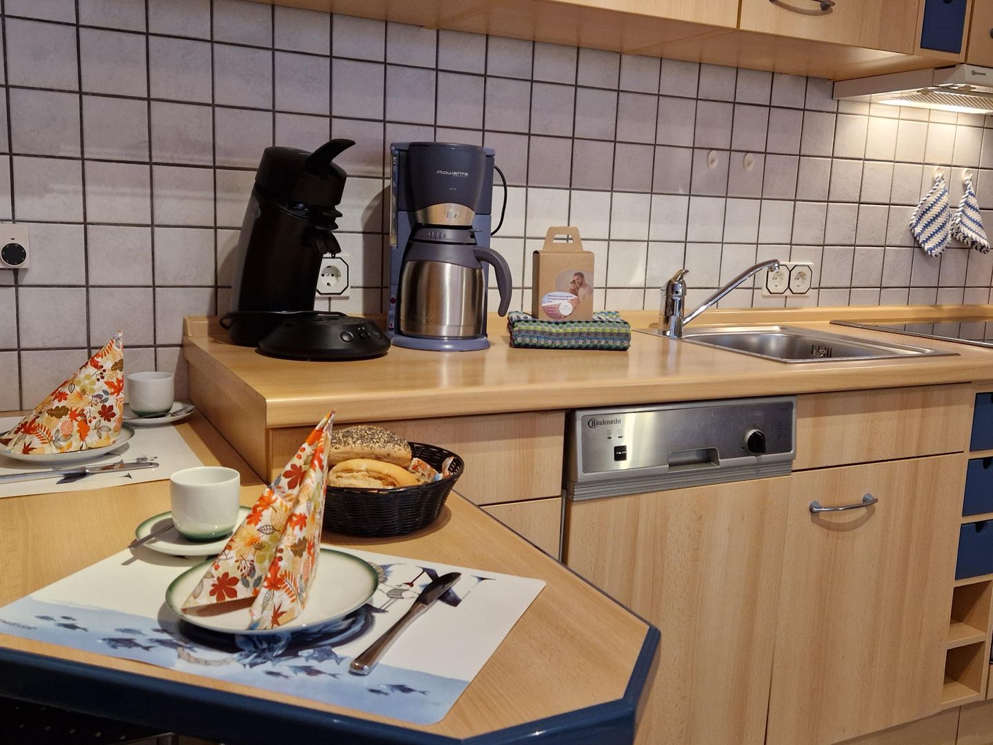 Ferner sind ein Toaster, Wasserkocher und eine Kaffeemaschine vorhanden.