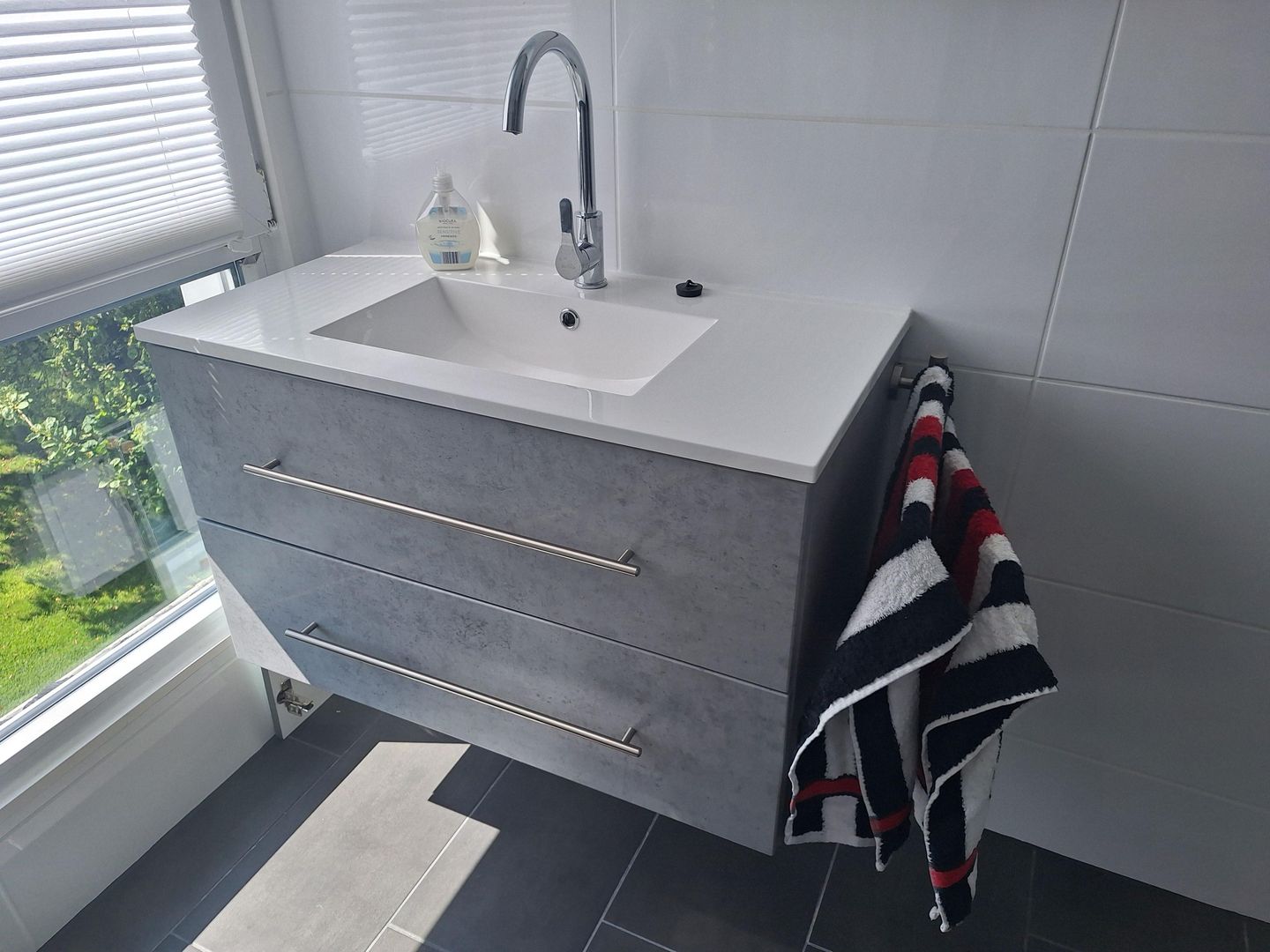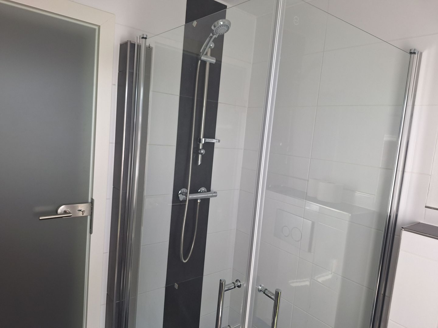 Neben dem Schlafzimmer befindet sich das renovierte Badezimmer, welches mit einer bodenebenen Dusche, Waschtisch mit Spiegel und einem Hänge - WC ausgestattet ist.