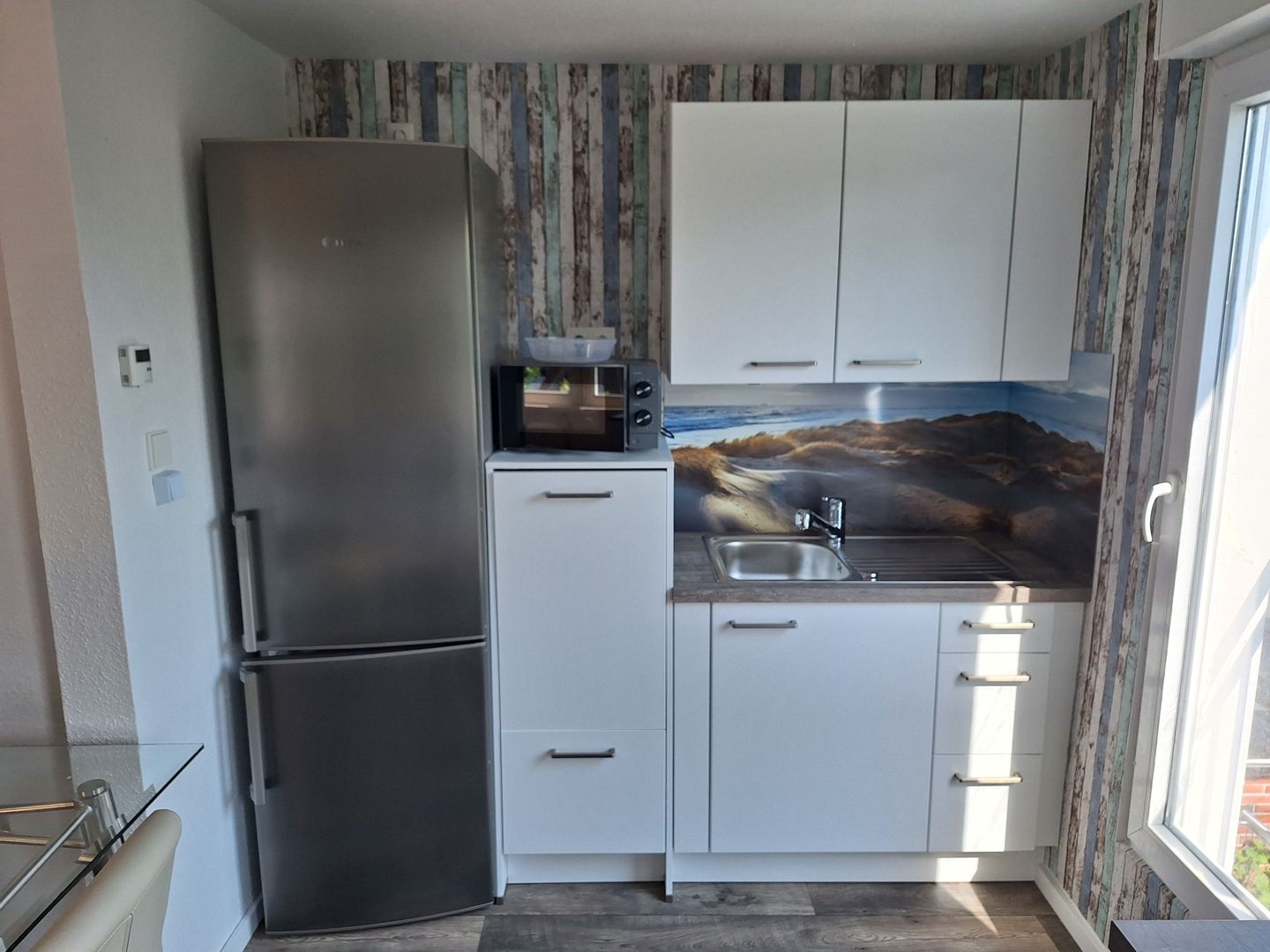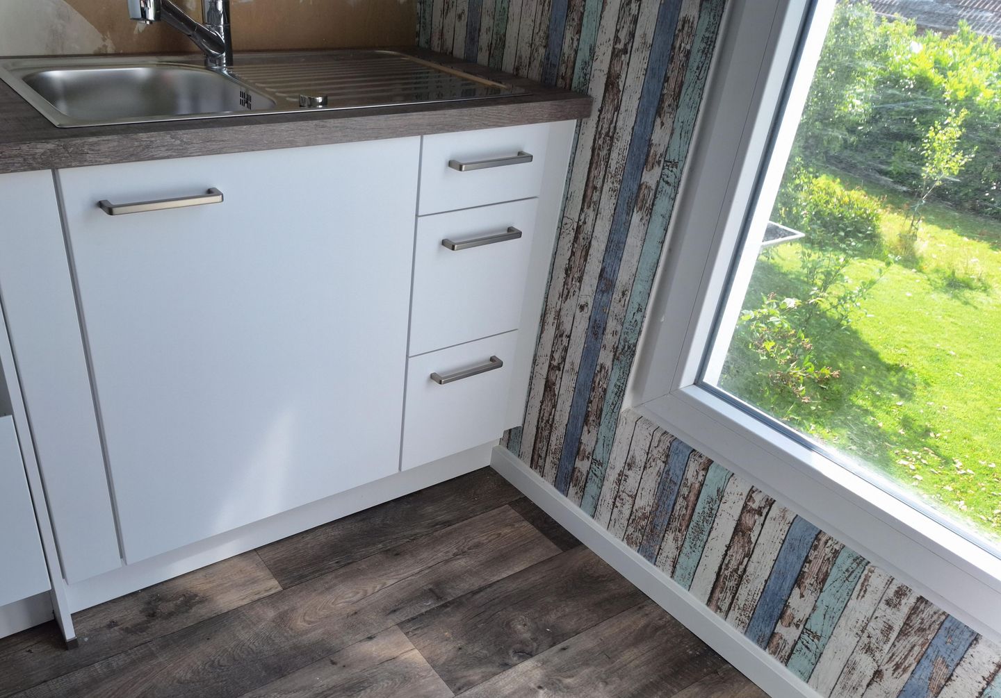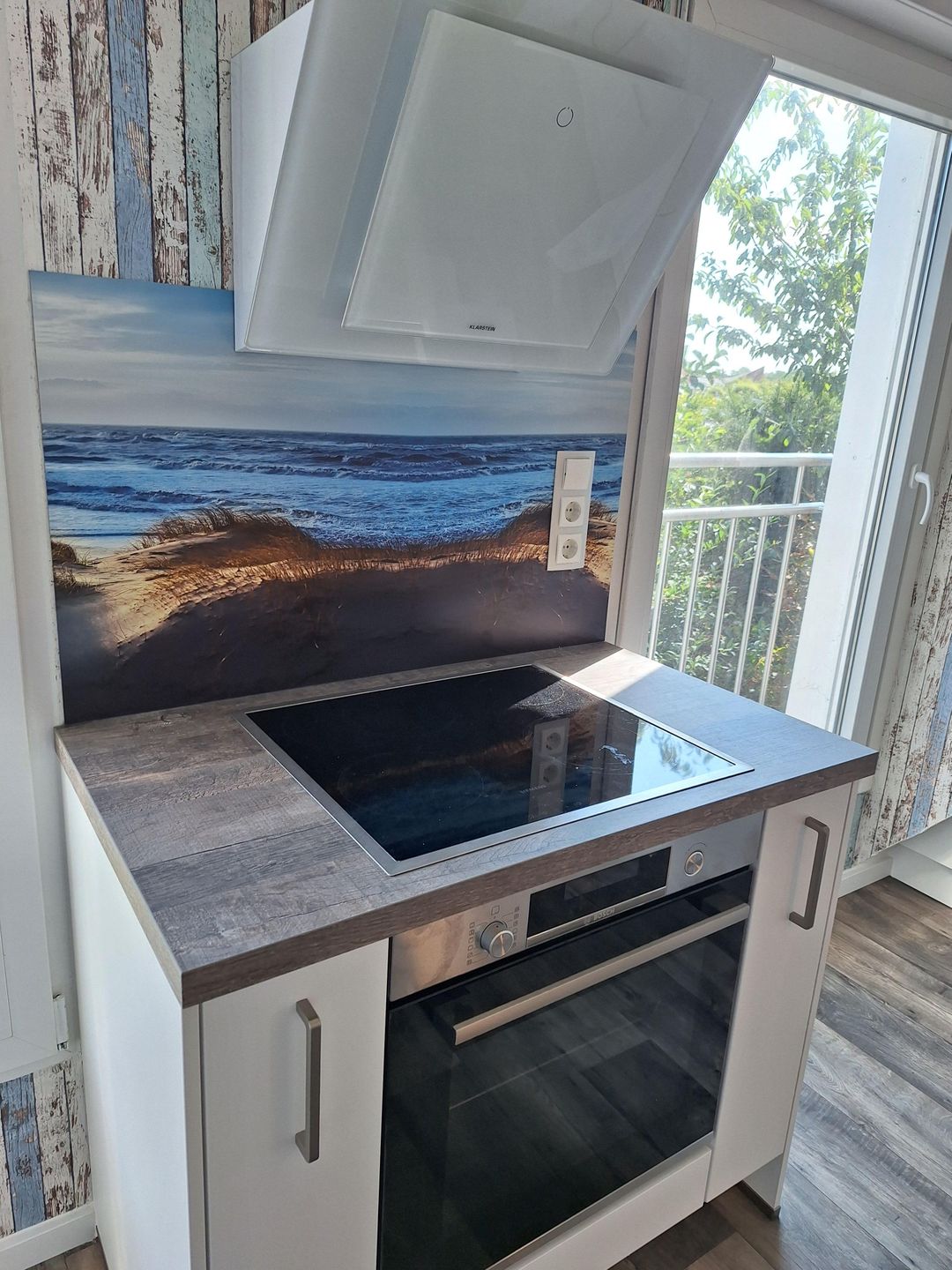 Der Wohn– und Essbereich ist mit einer modernen Küche ausgestattet. Diese beinhaltet einen Geschirrspüler, Backofen, Ceranfeld und eine Kühl – Gefrierkombination. Küchenzubehör, Geschirr, sowie eine Mikrowelle und Airfryer (Heißluftfritteuse) sind ebenfalls vorhanden.
